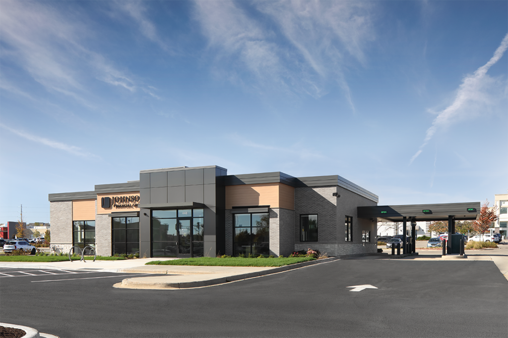 Johnson Financial Group opened a new branch near the West Towne Mall in Madison, WI. The City of Madison recommended renovating an existing single-story, drive-through bank rather than fully demolishing the structure. Therefore, Johnson Financial Group planned for an extensive 6,052-square-foot renovation.