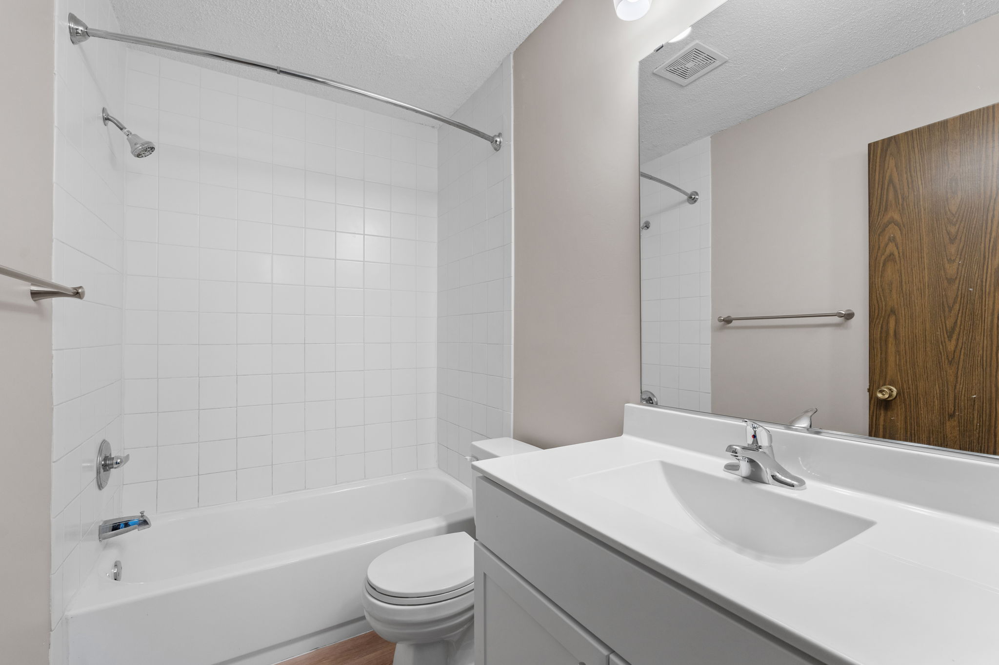 The project scope included demolition of existing kitchen and bathroom cabinets, countertops, appliances, flooring, tile shower surrounds, toilet accessories, and light fixtures, followed by installation of new finishes throughout all units.
