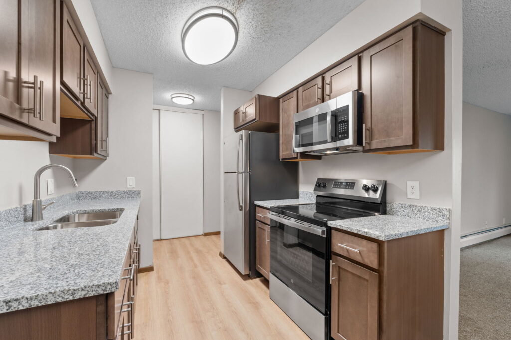 The Oakwood Apartments renovation in Plymouth, Minnesota included interior upgrades to 107 residential units, focused on kitchen and bathroom improvements and supporting building infrastructure.